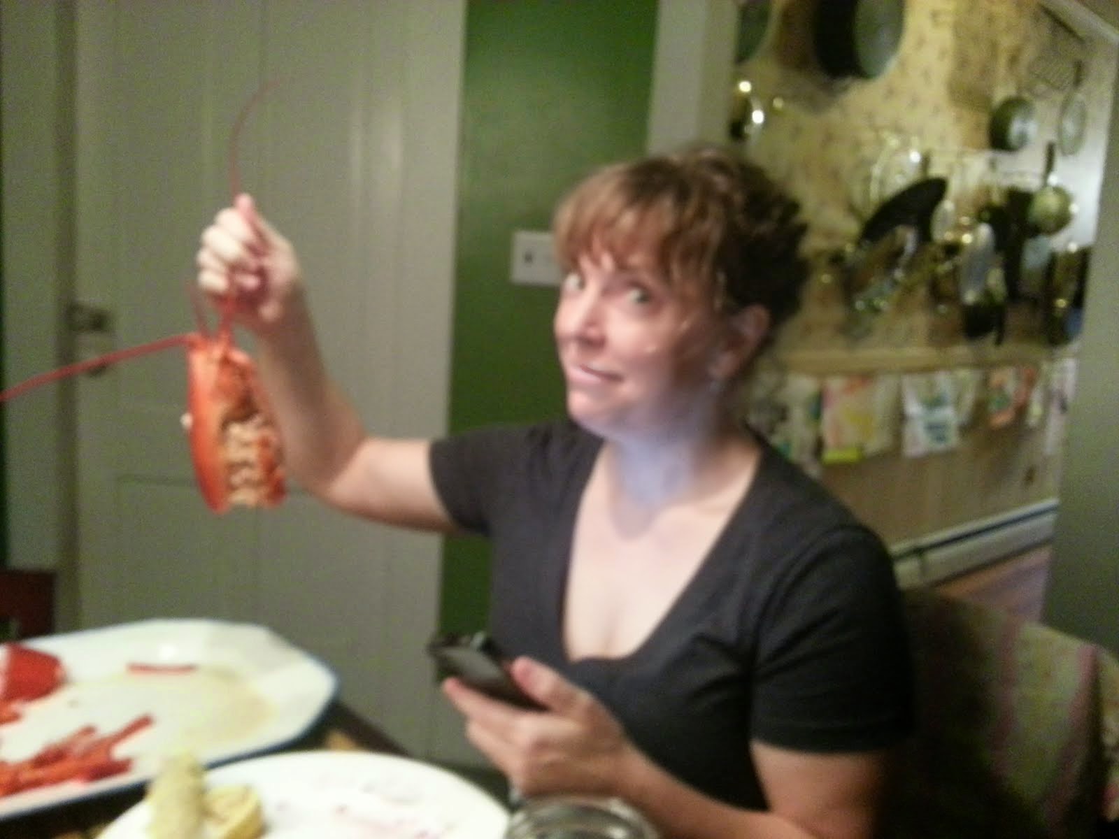 Here is my friend Robyn on the verge of succumbing to a violent lobster, bent on survival. Her husband did brandish tongs but then fled leaving Robyn -one of the toughest cookies on the planet- to tong Mr. Crazy-ass Lobster to a watery boiling death. Ben and I wept and held each other as the lobster cursed our mothers and perished, screaming. He was delicious. Note how Robyn resembles Dali with her insanified lobster.